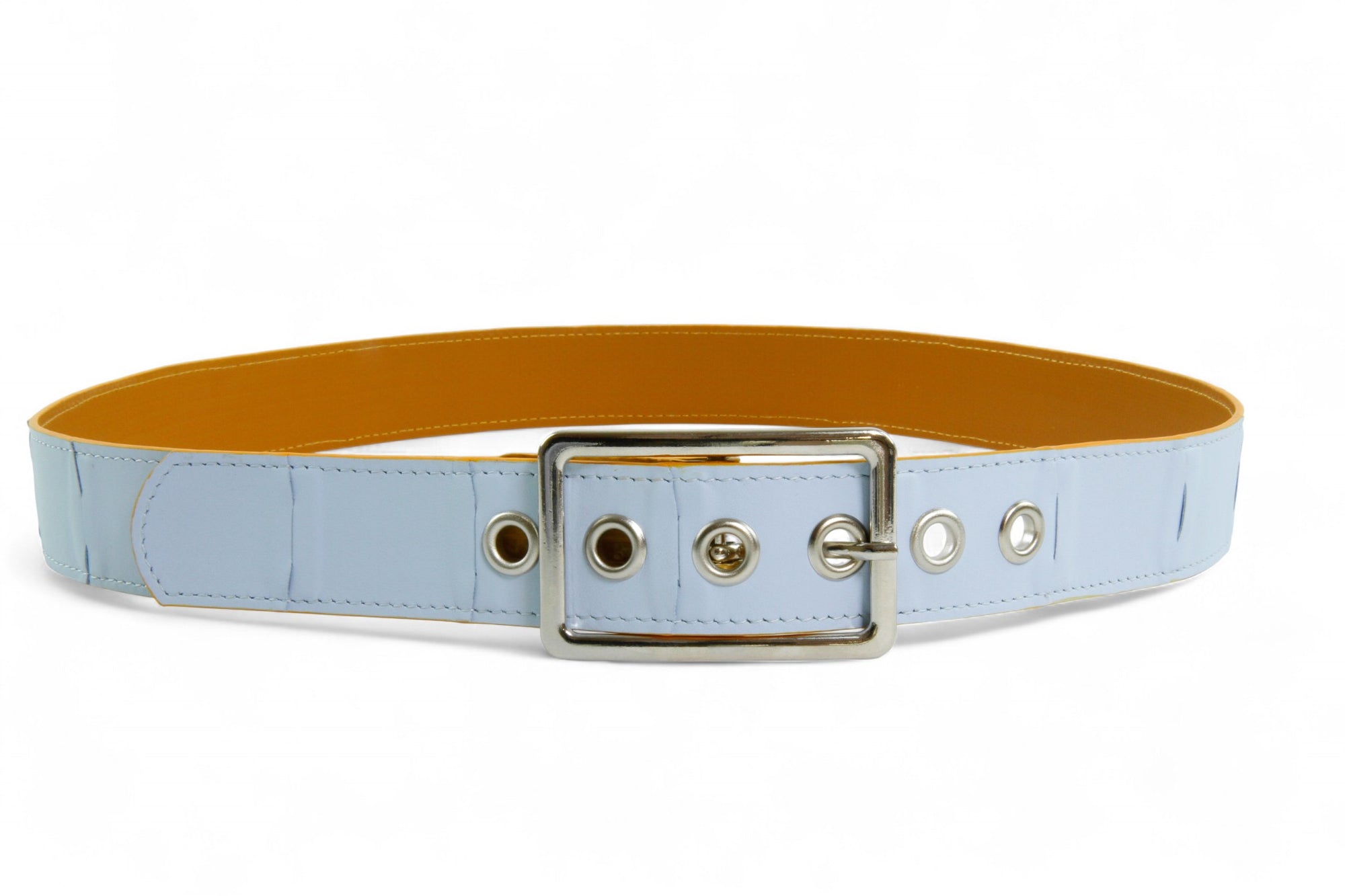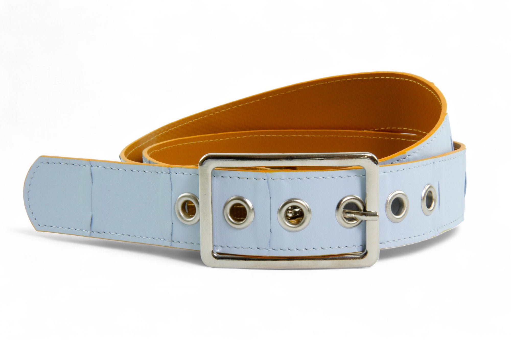 The leather we rescue from Burberry comes to us in very limited quantities, which means we can only ever craft a few pieces of any colour. The leather belt is available in the above colour combinations, but always with either yellow or red fire-hose on the inside. Different colour combinations will have either a silver or antique brass buckle and matching eyelets. We recommend putting these on with care, to protect the leather weave and ensure the longevity of your belt.