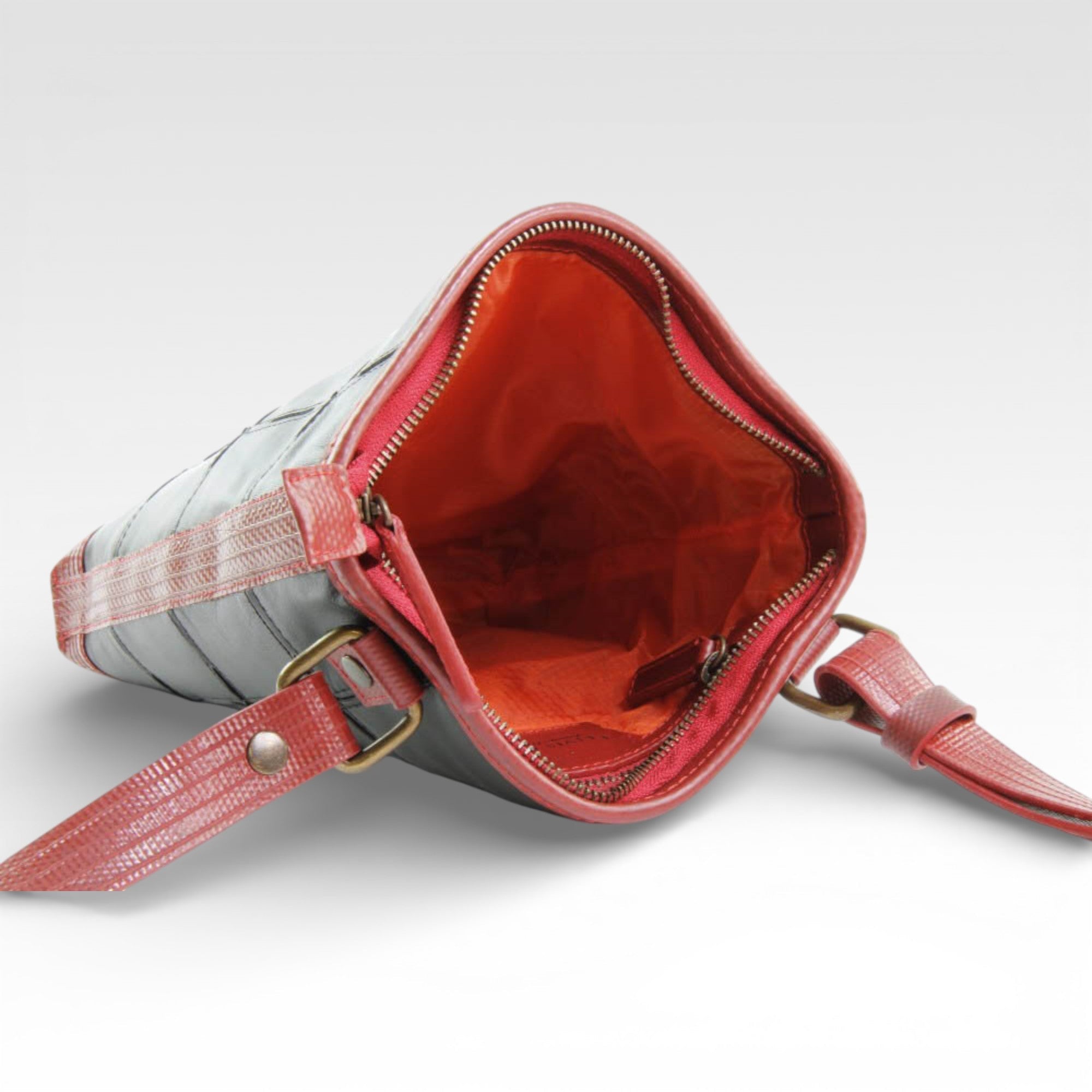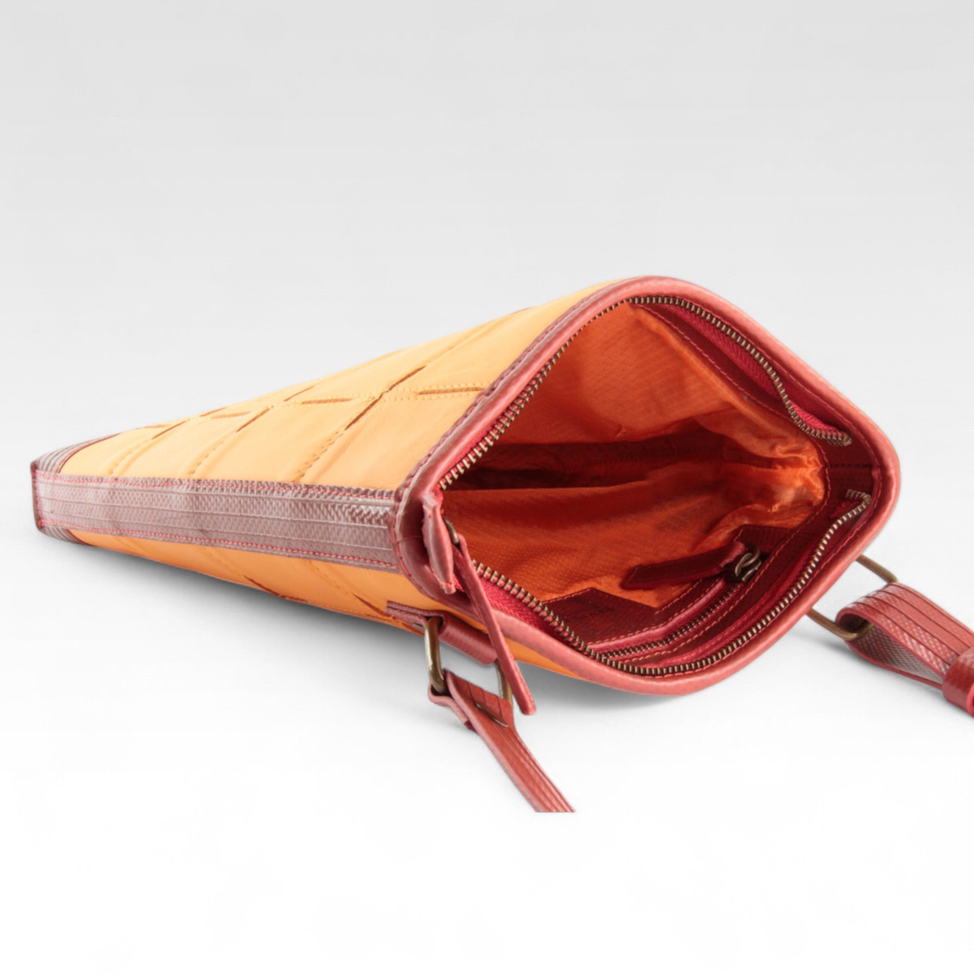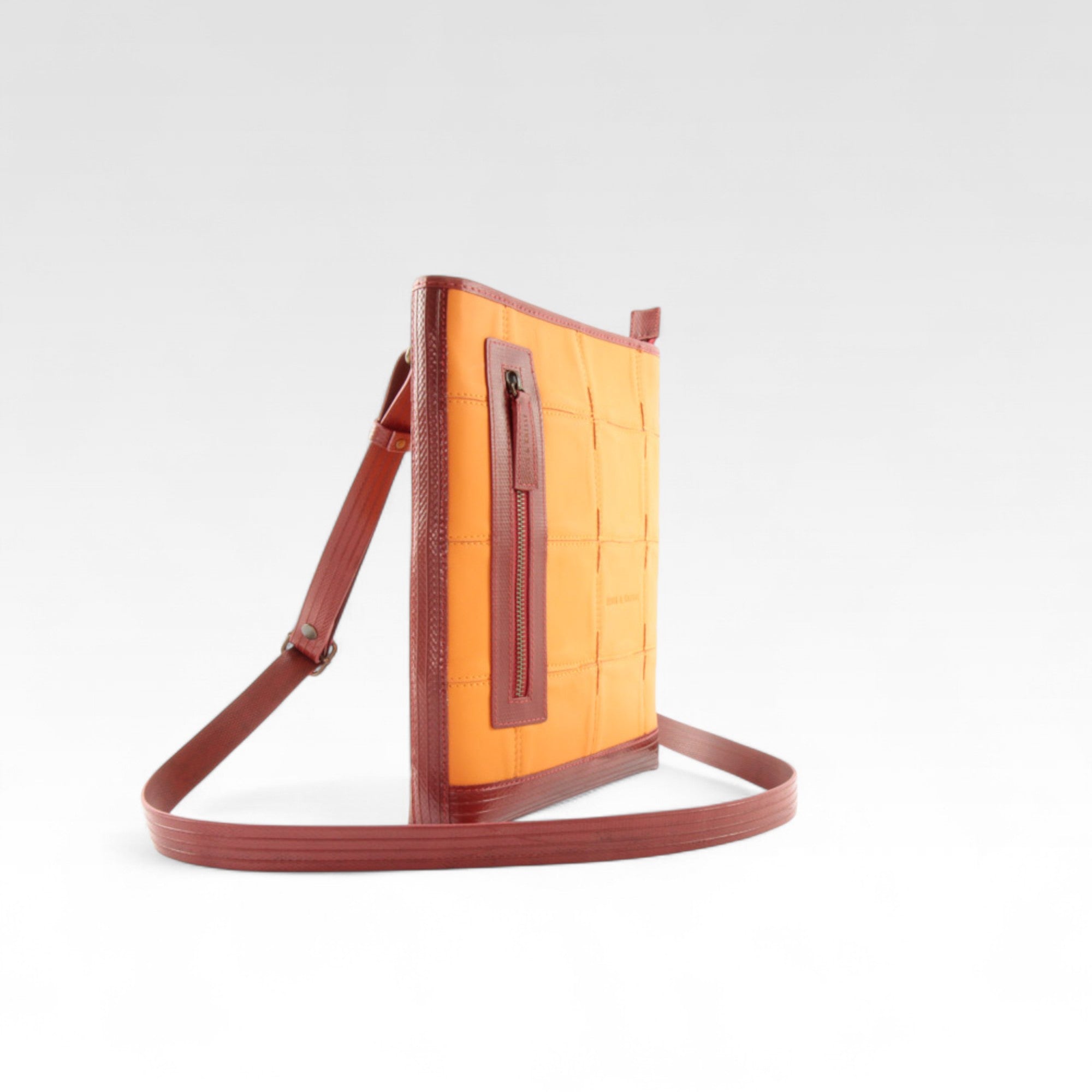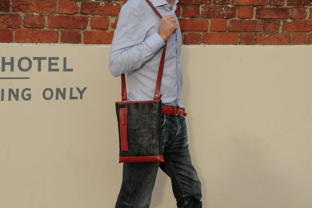 Our Leather Reporter Bag is the refined partner for all your daily essentials. It is handmade from a combination of rescued leather and our genuine decommissioned British fire-hose. The lining is crafted from reclaimed military-grade parachute silk. There is 1 internal zipped pocket and 1 external zipped pocket for quick access. Featuring a fully adjustable shoulder strap, the bag is unisex and is designed to be worn over the shoulder or across the body.