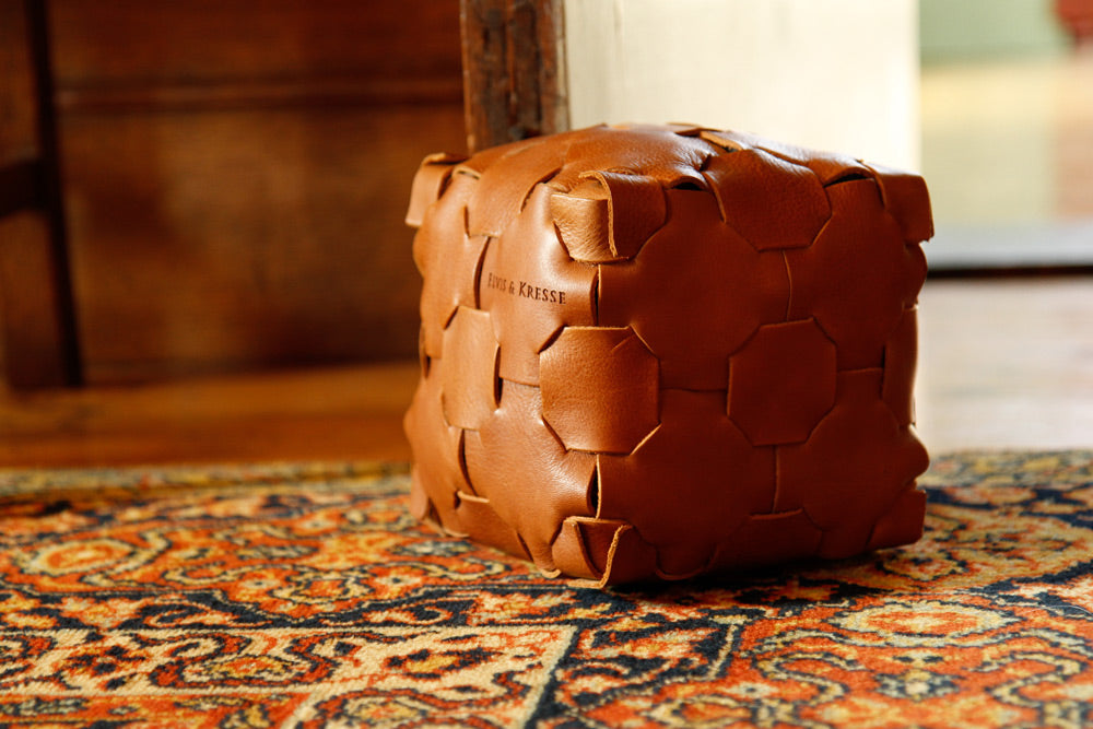The Elvis & Kresse rescued Leather Cubes are constructed from interlocking pieces of the finest quality leather; leather that we reclaim from a cross section of the very best British leathercraft manufacturers. Our leather partners cherish their hides, the waste they produce is in small seemingly unusable pieces, which is why we have had to develop this modular approach. We only work with the off-cuts produced by our leather partners so every piece we create is unique.