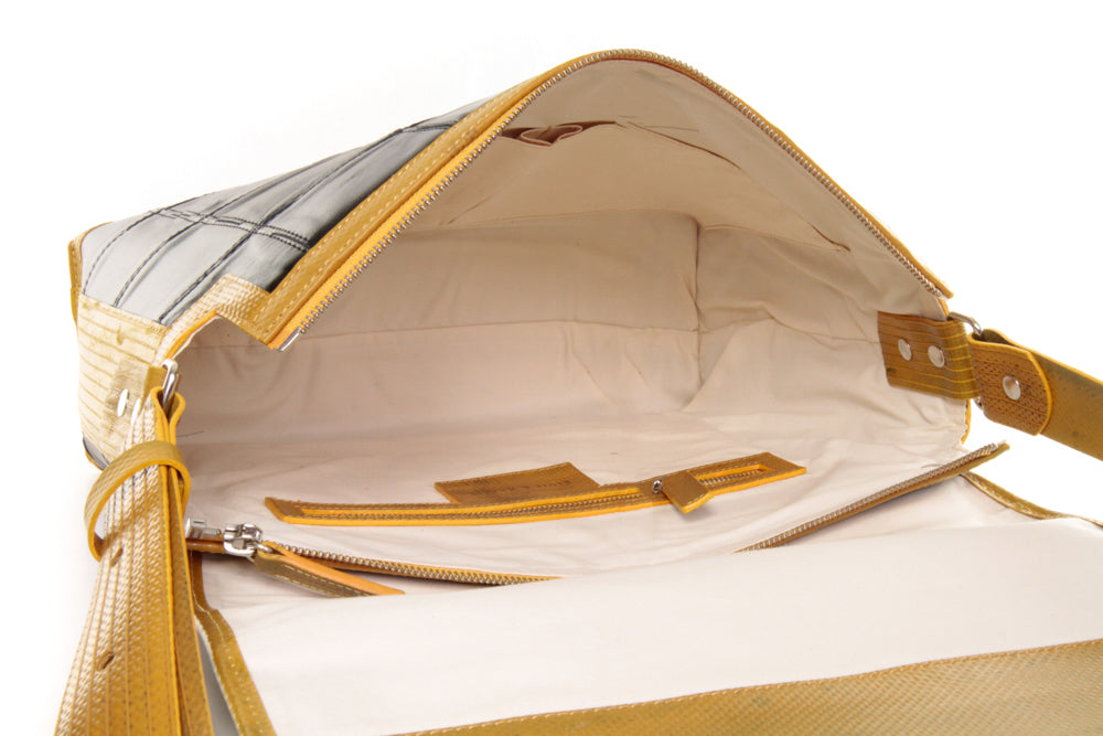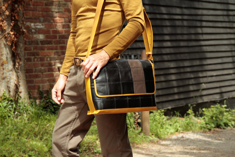 This is the Elvis & Kresse Field Bag: hard-wearing vintage fire-hose and hand-woven rescued Burberry leather are combined beautifully to create this relaxed yet elegant messenger-style bag. The contemporary design means you can comfortably carry a 14/15" laptop and the Field bag has both an internal zip pocket and 2 easy-access poacher's pockets. The Field Bag is designed to be carried over the shoulder and has an adjustable strap.