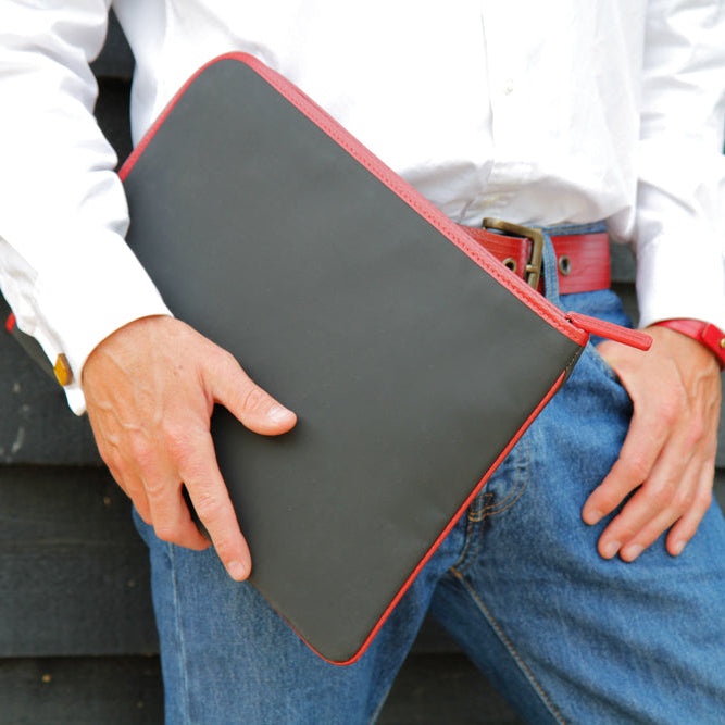 We also offer a Limited Edition 'Print Room' version of our Folio / Laptop case. Made from reclaimed printing blankets combined with our signature decommissioned fire-hose, this limited edition, sustainable laptop case really makes a statement. The re-engineered black printing blanket creates a visually stunning textile that is strong and beautiful to the touch. This version of the case maintains all the design features of the full fire-hose version as described above.