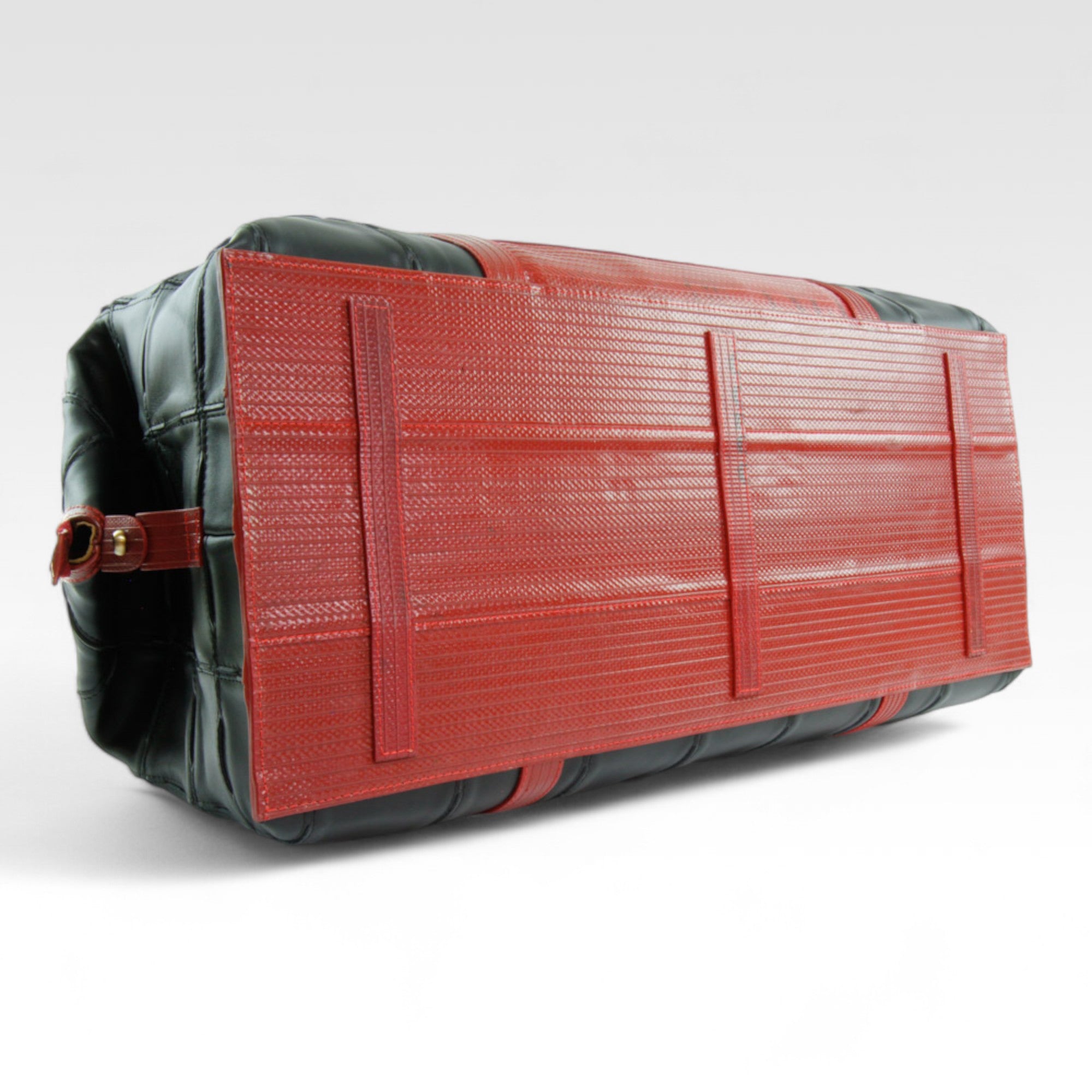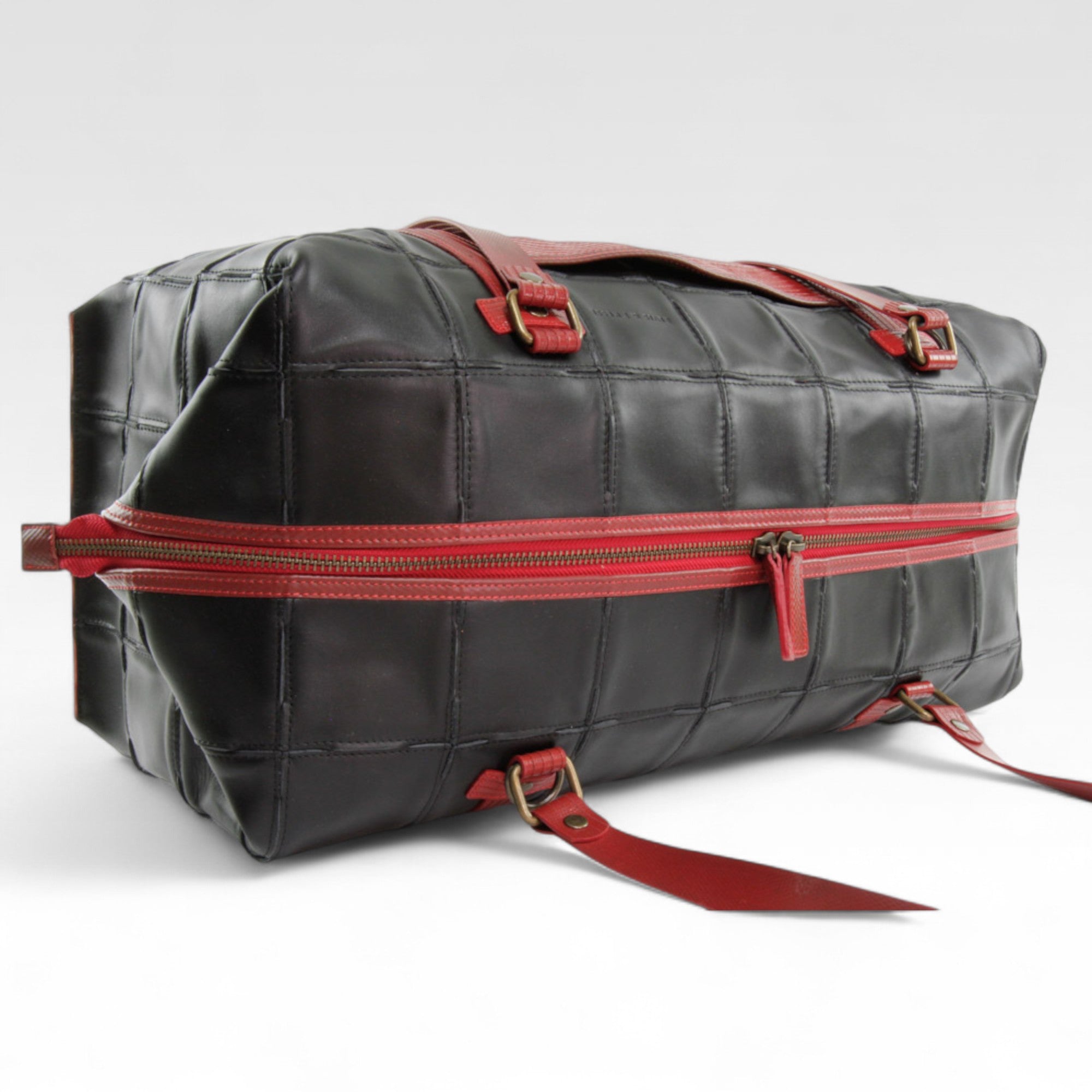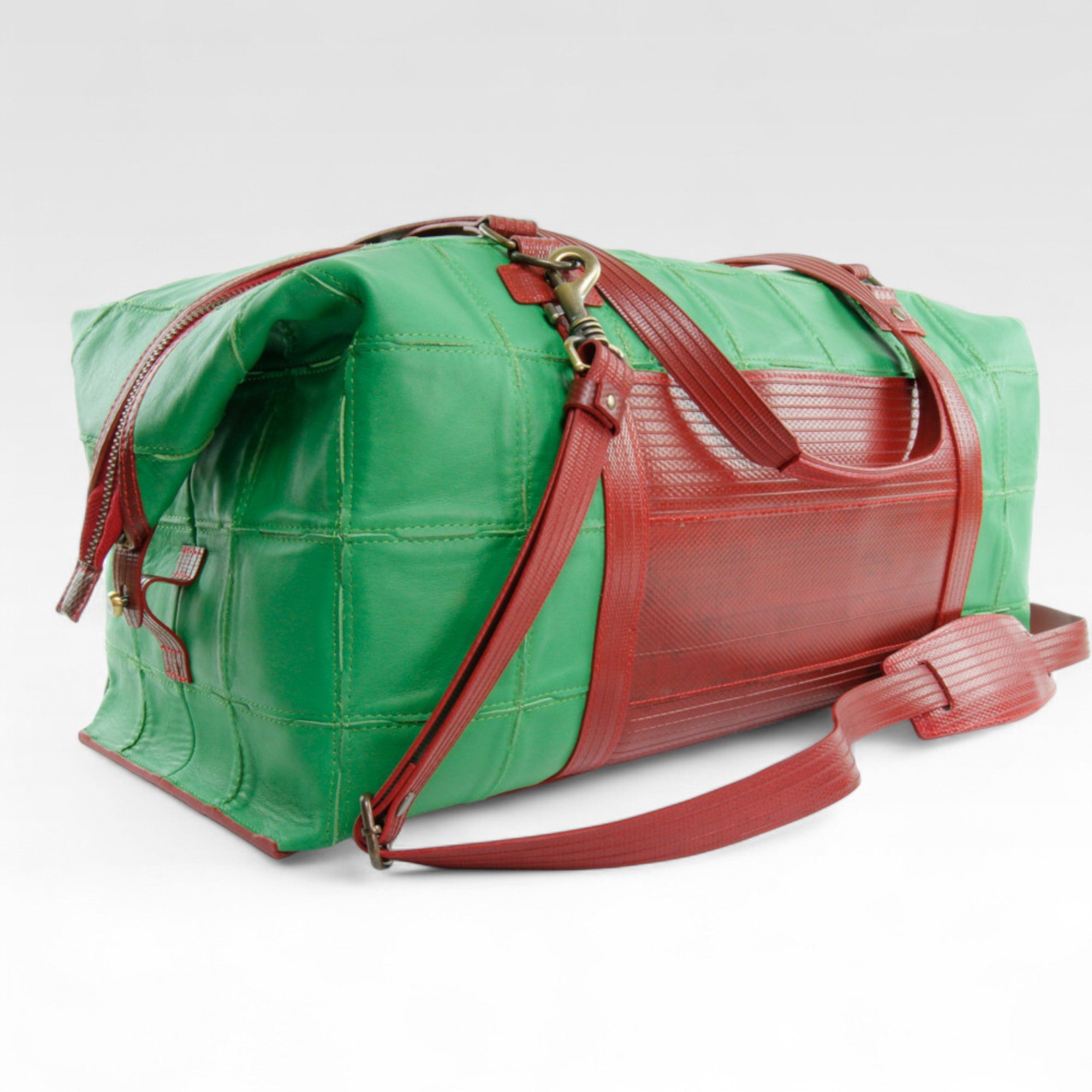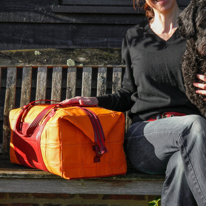 The Leather Weekend Bag is handmade from rescued Burberry leather pieces, decommissioned fire-hose and reclaimed lining material. The Elvis & Kresse signature fire-hose is the perfect partner to the hand-woven leather, deployed in all vital areas: the base, the handles and the strap.