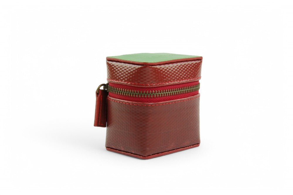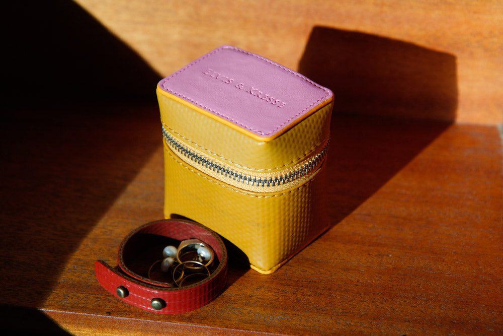 The Small Leather Box is made from rescued Burberry leather off-cuts, genuine decommissioned fire-hose and lined with reclaimed parachute silk. These diminutive and beautifully crafted leather jewellery boxes look great on your desk or side table and are perfect for storing away all your smallest valuables. As with the rest of our range, 50% of the profits from this unique piece is donated to charity.