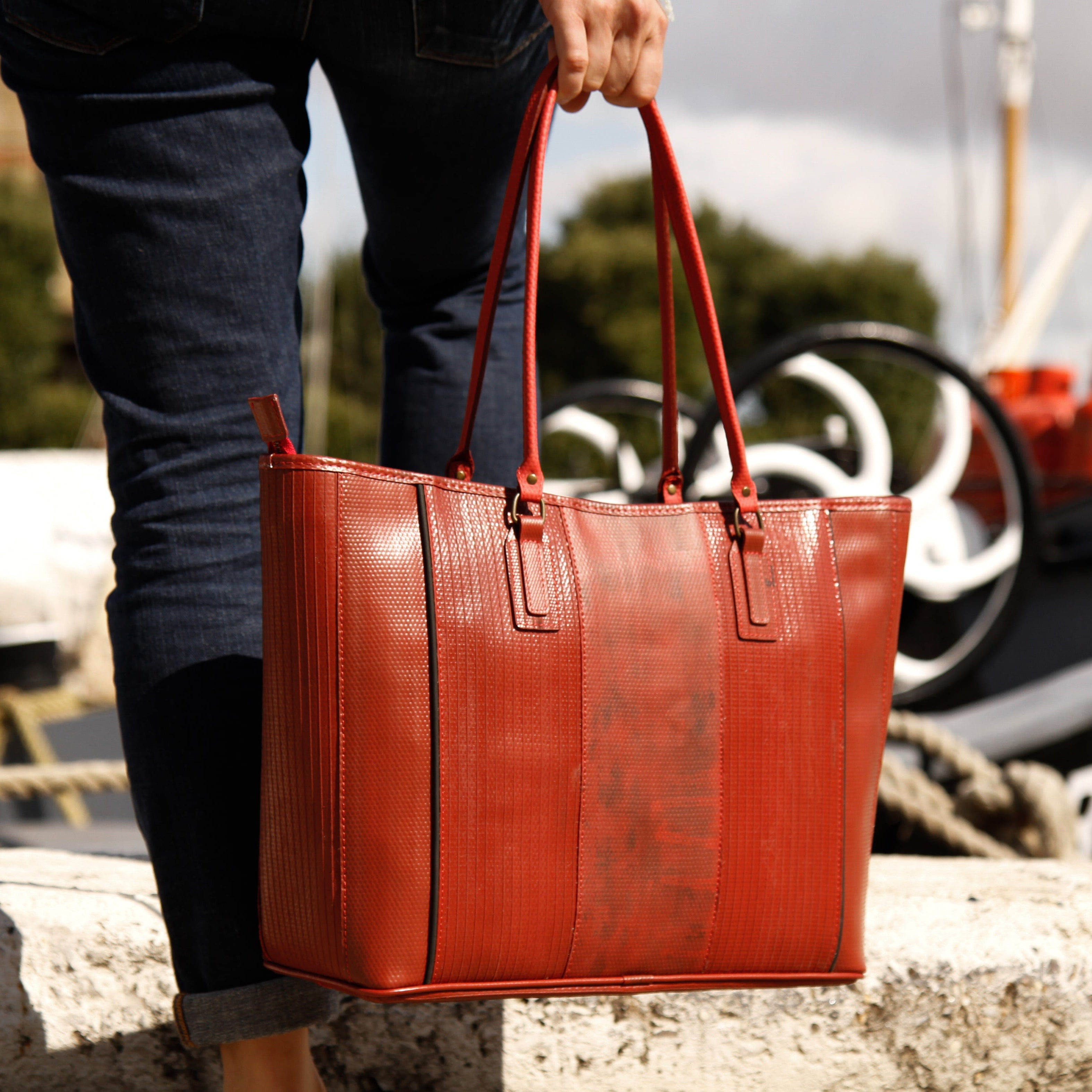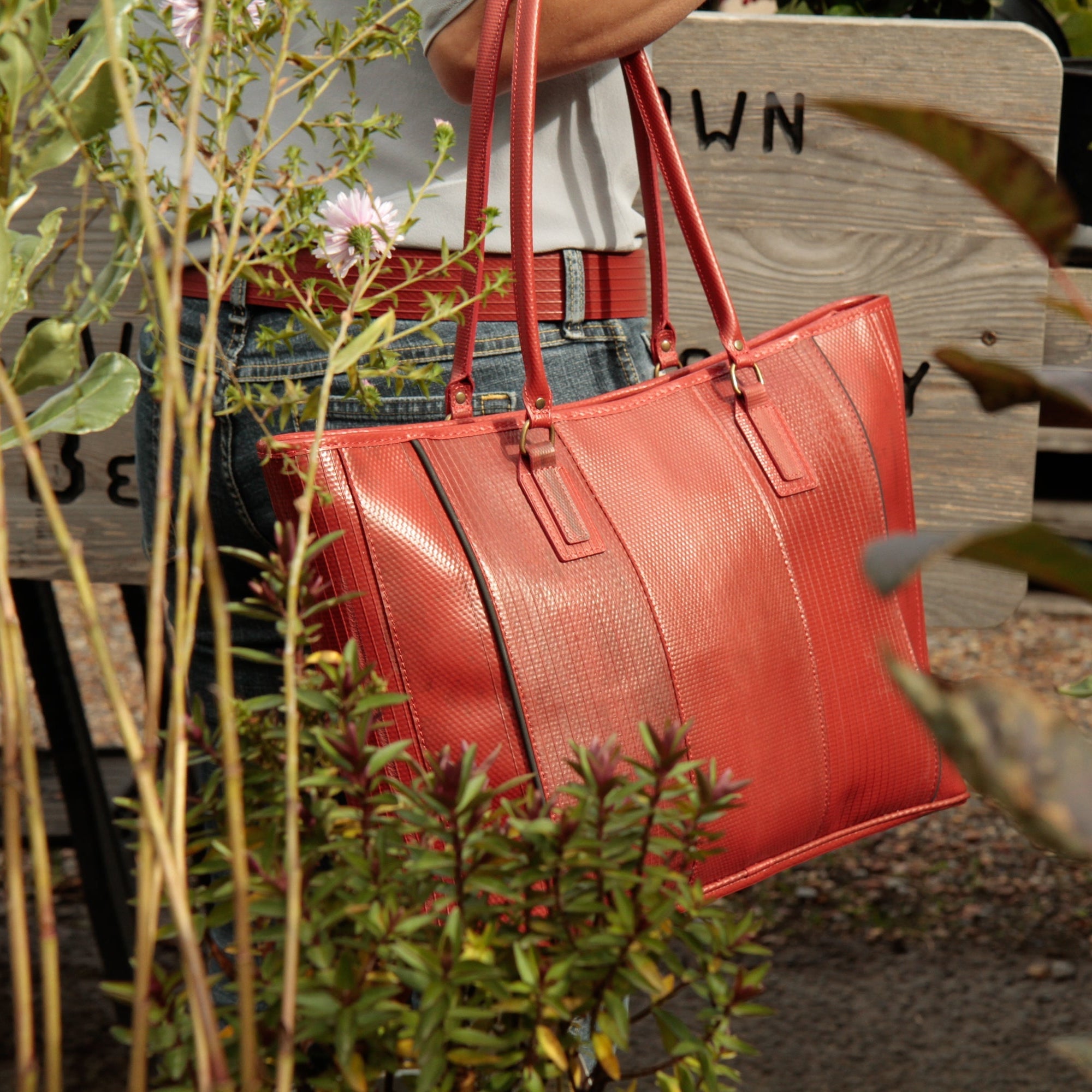 Our classic Tote Bag is available in red or yellow fire-hose.