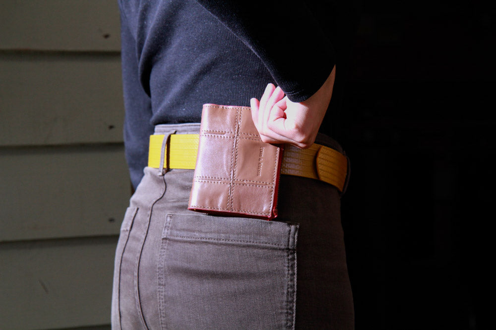 The Leather version of our Faversham folding wallet combines hand-woven rescued Burberry leather and decommissioned fire-hose and is lined with reclaimed parachute silk. Named after the vibrant and creative Kent town where our workshop is situated, the leather bifold wallet features 6 credit card slots, a section for notes, 2 additional sections for business cards and a zip pocket for coins.