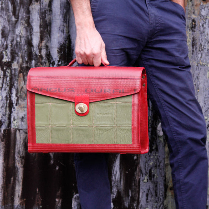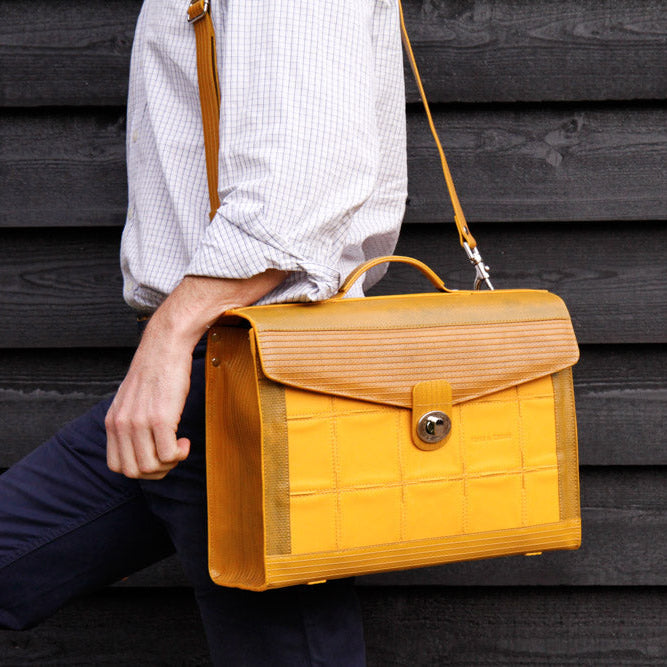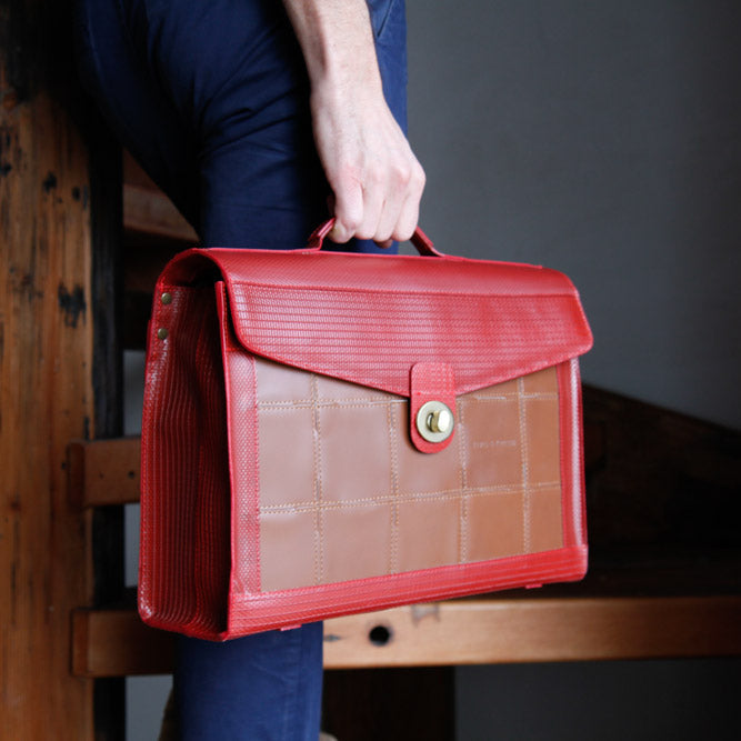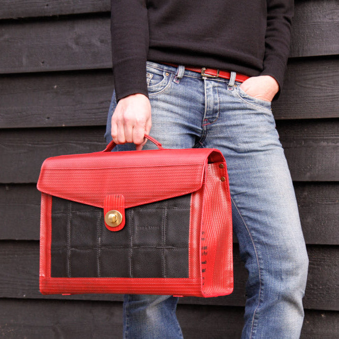 Available in multiple different leather colours and two different fire-hose trims. The ethical briefcase comes with a fully adjustable and detachable shoulder strap.