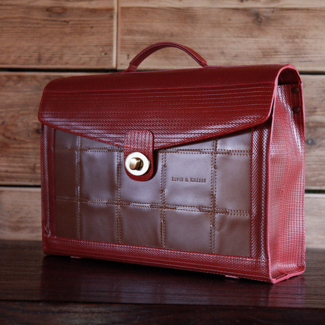 The Elvis & Kresse fire-hose and leather Continental Briefcase is a beautifully and ethically crafted business bag. Our highly skilled team handcraft this from a combination of our signature decommissioned fire-hose and hand-woven rescued Burberry leather off-cuts, with a reclaimed military-grade parachute silk lining. The sustainable briefcase offers ample space for all your day-to-day work paraphernalia, with a full-width external pocket and internal zip pocket and 2 additional poacher-style pockets.