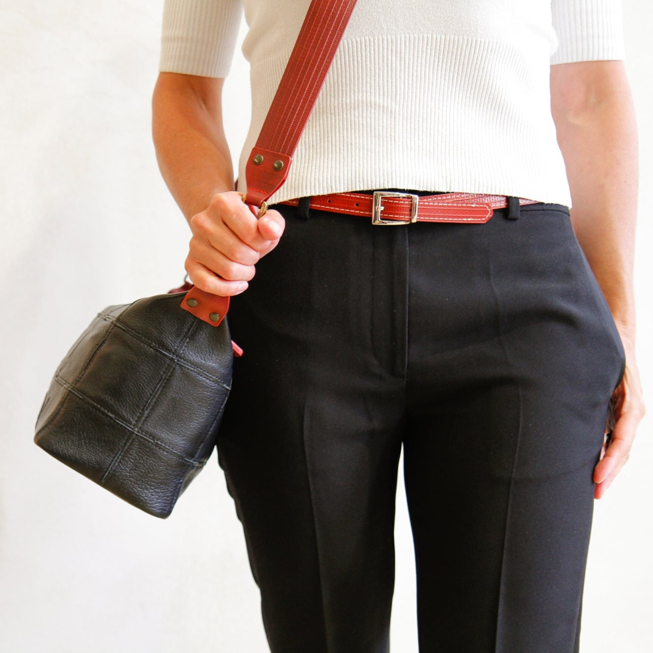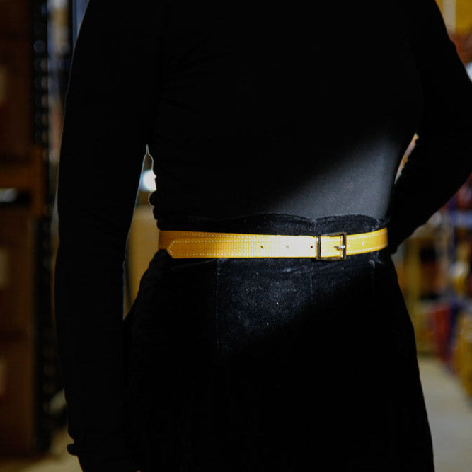 The vegan leather Skinny Stitch Belt - Definitely one for the ladies, we call it skinny because it's just 1.75cm wide. Decommissioned fire-hose is transformed through meticulous craftsmanship and a contrasting elegant white stitching. The combination of our signature red fire-hose with an antique silver buckle creates a susutainable belt that looks as good with a pair of jeans as it does hugging that little black dress.