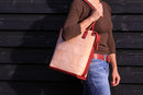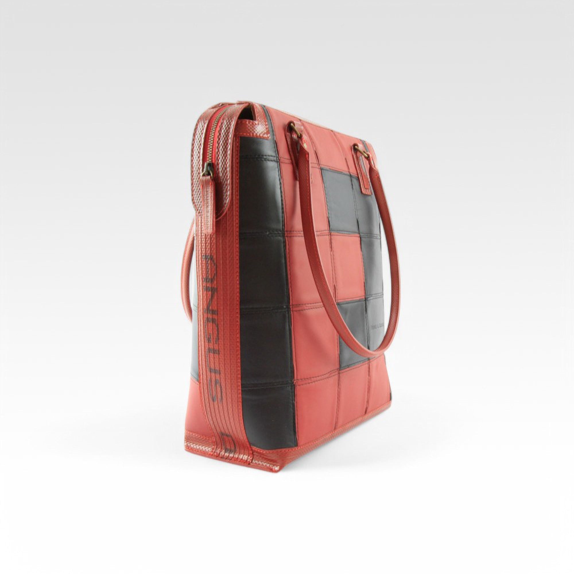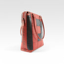 The Dutch Tote is a large leather tote bag handcrafted using the finest rescued leather accentuated by our signature decommissioned fire-hose and is lined with reclaimed material. This large leather tote bag was inspired on a trip by Elvis & Kresse to The Netherlands, where they saw a very sophisticated lady perfectly and discretely slide 3 bottles of wine into her bag. Designed to be held in the hand or carried over the shoulder, our Dutch Tote has an inside zip pocket and 2 additional poacher-style pockets.