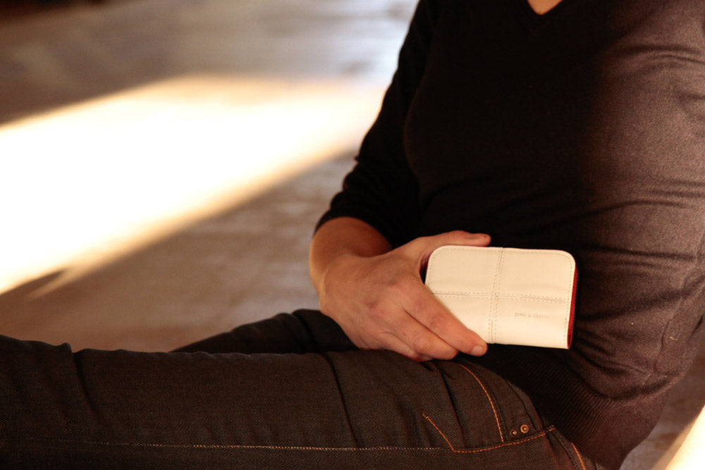 The Fire & Hide Pocket / Bag Organiser can be used either as a stand alone card and notes case or as a handy bag organiser. It combines hand-woven rescued Burberry leather with our signature decommissioned fire-hose and is lined with reclaimed parachute silk. The bag organiser is a highly practical piece designed to keep all your small bits and bobs safe and tidy.