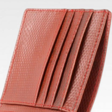 The Billfold Wallet with Coin Pocket combines handwoven rescued Burberry leather outer and decommissioned fire-hose inner with a reclaimed military-grade parachute silk lining.