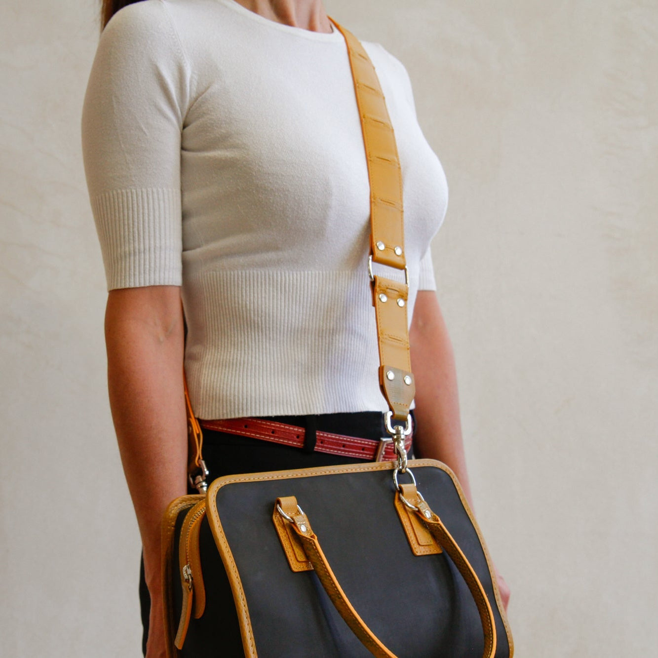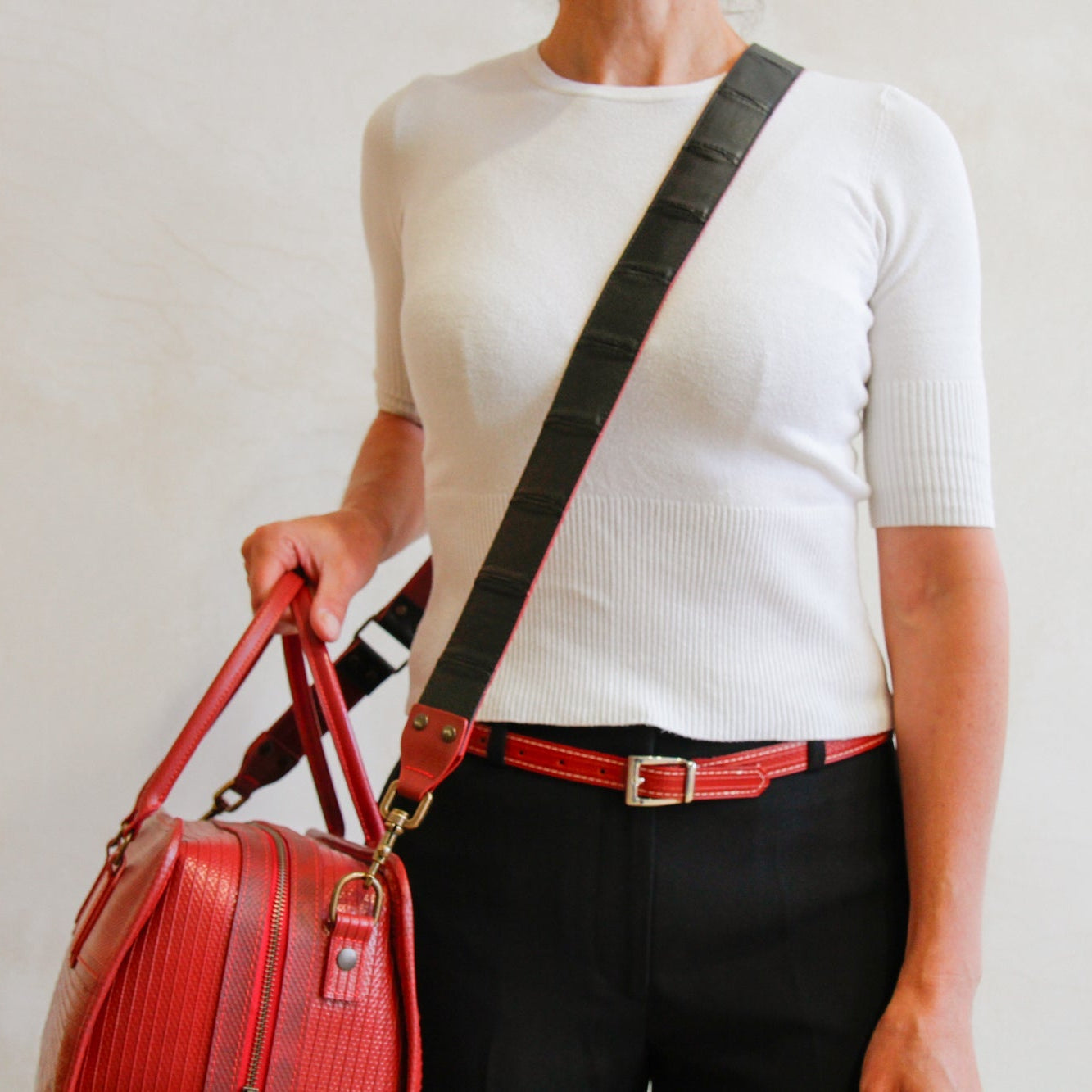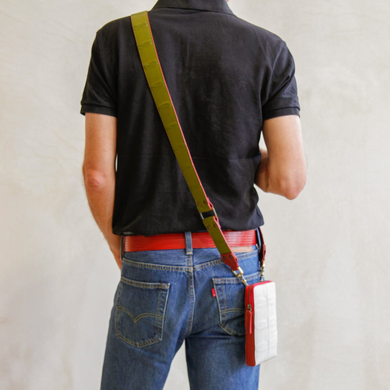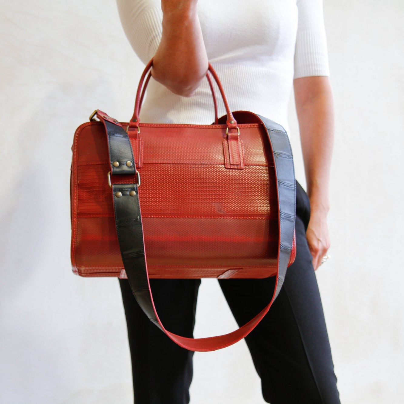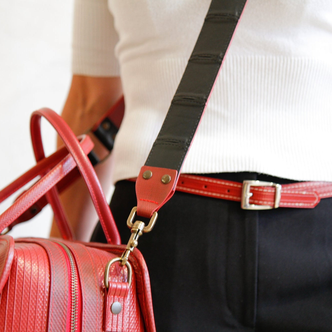 Add a splash of colour to your favourite bag with our leather shoulder straps. The front side is crafted from our exquisite, hand-woven, reclaimed leather and it is backed with our signature decommissioned fire-hose. The straps come in 4 different sizes to make sure that you can wear your bag exactly how you like it.