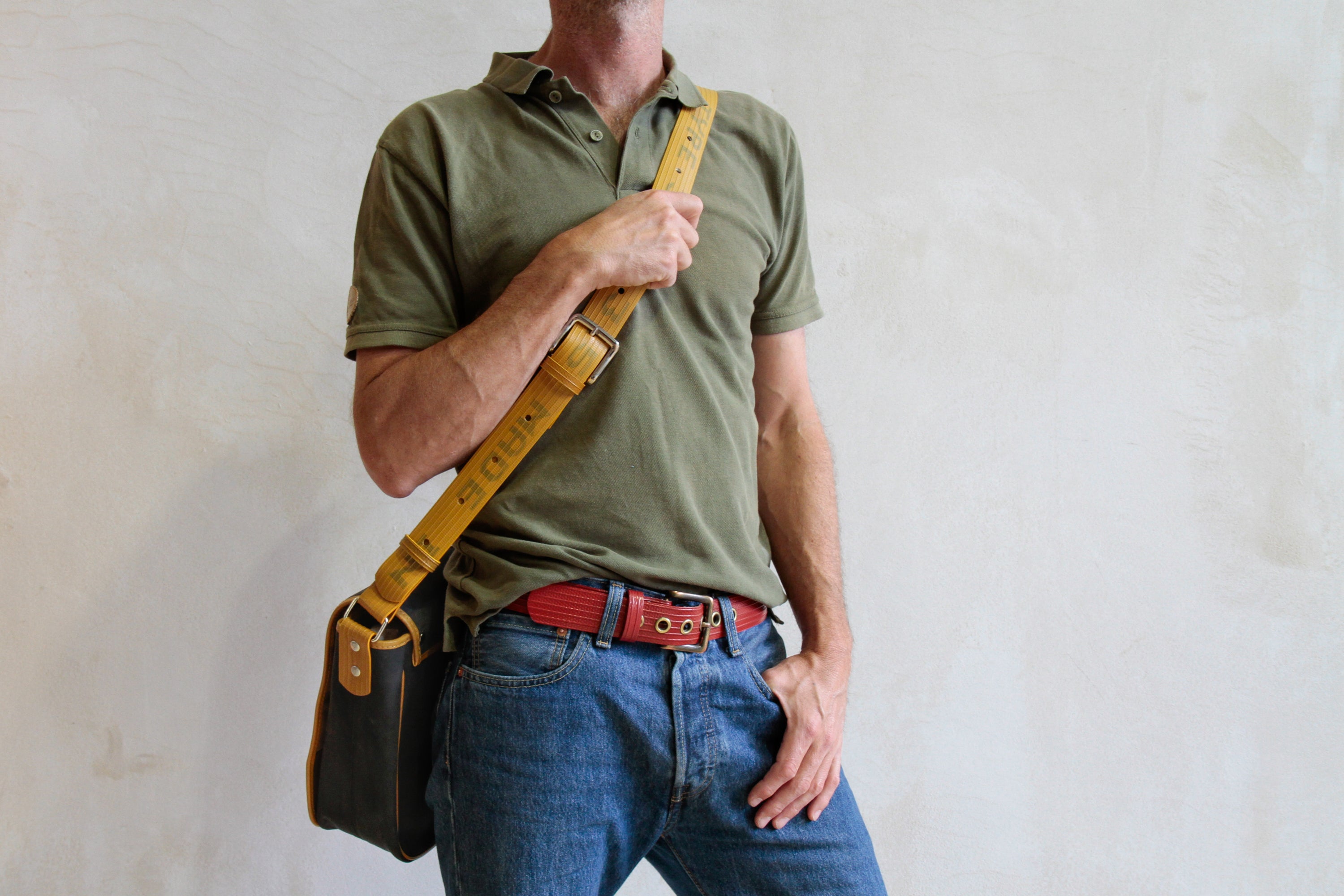 • Adjustable shoulder strap in genuine decommissioned British fire-hose