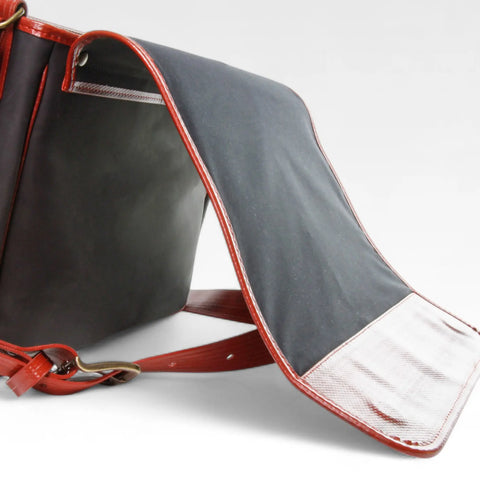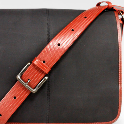 The Elvis & Kresse Messenger Bag is made from a combination of reclaimed printing blanket and genuine decommissioned fire-hose. The lining is made from reclaimed cotton and rescued military-grade parachute silk. A great every day bag with a full length flap, with hidden magnet closures, which will keep your valuables safe. It has an internal zip pocket, a laptop divider and 1 full length zipped pocket under the flap.