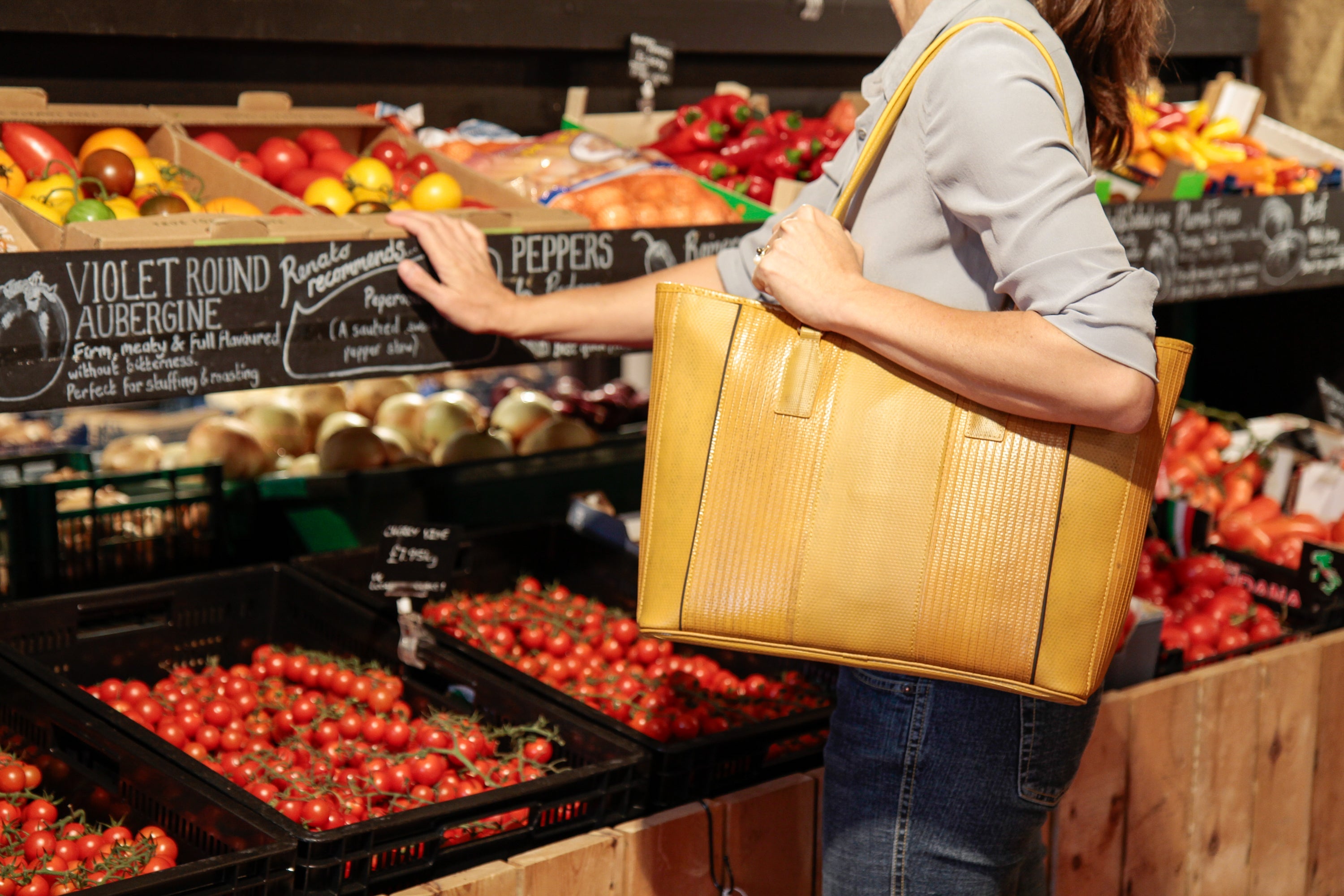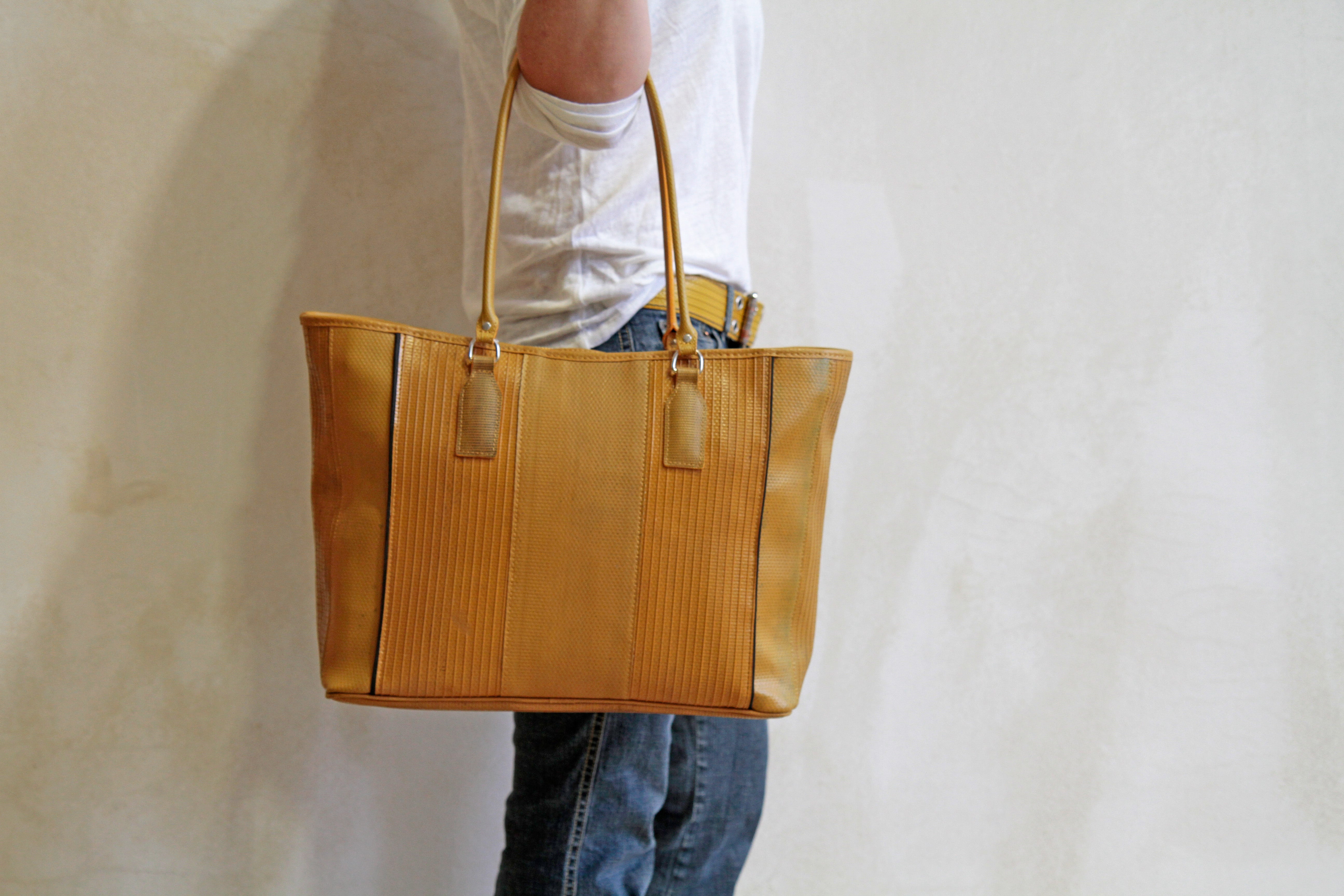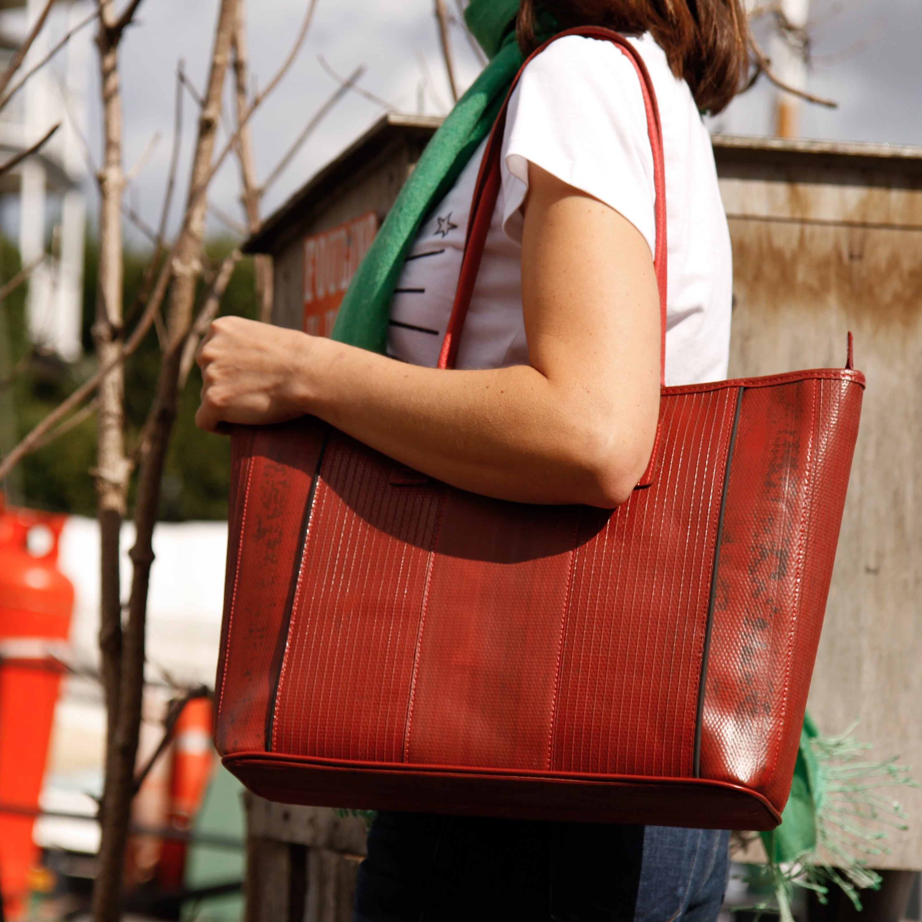 Our classic Tote Bag is available in red or yellow fire-hose.