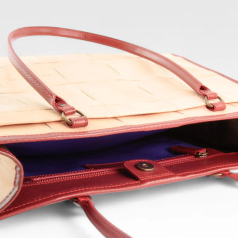 For many years we have been walking on the beach at Whitstable with our dogs... this genuine leather tote bag is inspired by its bright, boxy beach huts. The Whitstable Tote is a leather tote bag handcrafted using the finest rescued leather, accentuated by our signature decommissioned fire-hose, and finished with a reclaimed lining. A great all day leather tote bag for those that like easy access to everything you carry. Designed to be held in the hand or carried over the shoulder, our Whitstable Tote has an inside zip pocket, an additional framed pocket and a large external pocket with a magnetic closure.